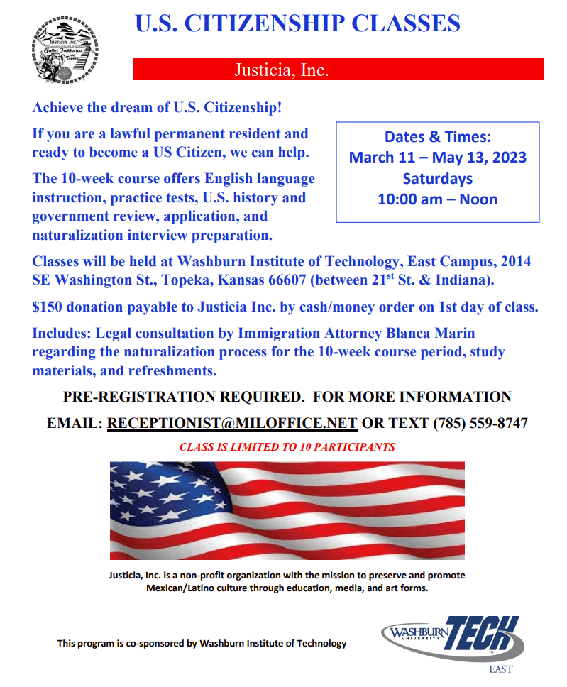 Weekly citizenship classes taught by immigration attorney Blanca E. Marin and Tina Williams, instructor with a masters in ESL education. Classes offer one-on-one instruction, practice tests, English language instruction, U.S. history and government review, and naturalization interview preparation. CLASSES LIMITED TO 10 PARTICIPANTS.